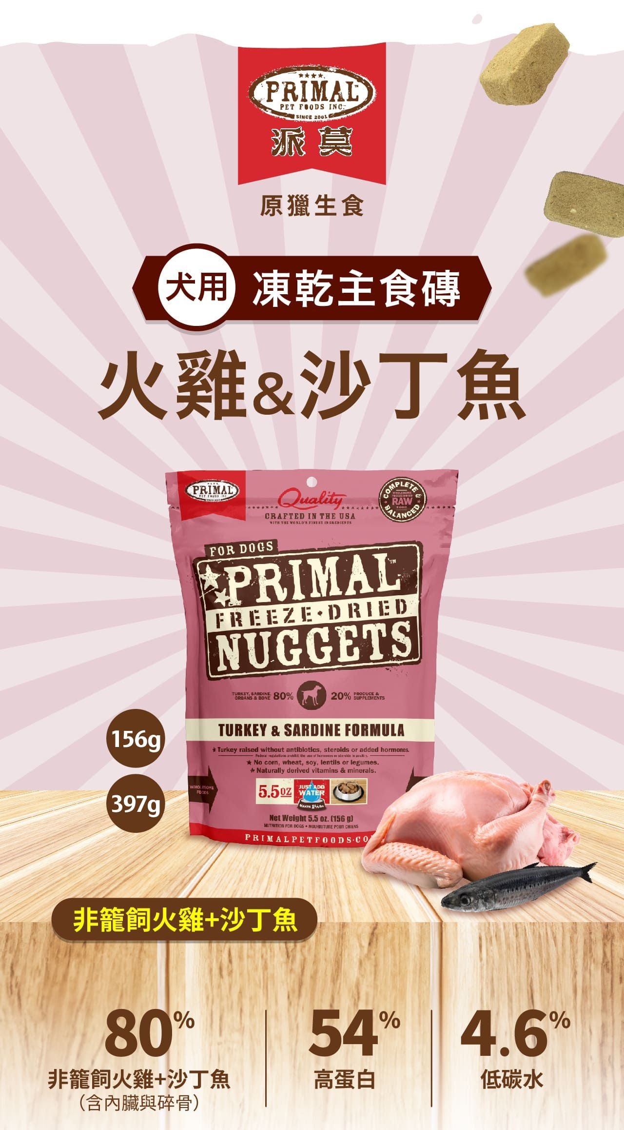 派莫 PRIMAL 原獵生食 犬用凍乾主食磚 火雞&沙丁魚